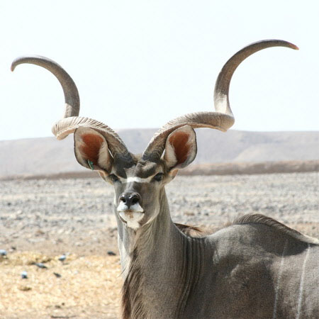Das Fell der Männchen ist graubraun, das der Weibchen und Jungtiere mittelbraun gefärbt und mit sechs bis zehn weißen Querstreifen versehen. Die Tiere verfügen über große, runde Ohren und einen buschigen Schwanz. Die Männchen tragen ein Schraubengehörn, das bis zu 105 cm lang wird, entlang der Schraubenwindung gemessen erreicht es 160 cm. Die Hornspitzen stehen etwa 80 cm auseinander. Der Nachwuchs entspricht im Aussehen den hornlosen Weibchen, heranwachsende männliche Jungtiere können anhand der Anzahl der Windungen bestimmt werden, da die erste Windung etwa mit zwei Jahren ausgebildet ist.
