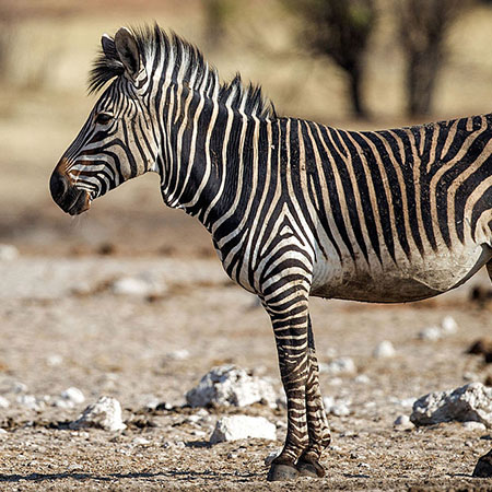 Alle Gliedmaßen enden in je einem Zeh mit einem sehr kompakten Huf. Der Kopf ist groß und mit bis 23 cm langen Ohren ausgestattet, die gerundete Enden besitzen, wobei die oberen Ränder häufig weiß gefärbt sind. Das Maul ist schwarz gefärbt. Das Fell insgesamt besteht aus sehr kurzen Haaren, die durchschnittlich nur 1 cm lang werden. Die längsten Haare befinden sich an der kurzen Stehmähne und an der Schwanzquaste