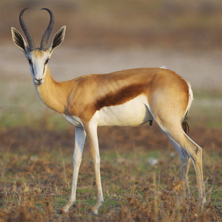 Springböcke wie diese haben sie einen dunklen, rotbraunen Streifen, der die gelbbraune Oberseite von der weißen Bauchseite trennt. Am weißen Kopf erstreckt sich ein dünner Streifen von den Augen bis zum oberen Maulwinkel. Die verlängerten Rückenhaare kann man nur sehen, wenn das Tier „prunkt“, das heißt, mit steifen Beinen und gekrümmten Rücken emporspringt – das namengebende Verhalten. Beide Geschlechter tragen geringelte, leierförmige Hörner; die der Weibchen sind allerdings schlanker.
