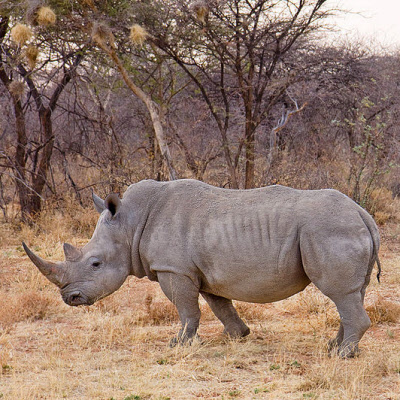The white rhino has an immense body and large head, a short neck and broad chest. On its snout it has two horns. The front horn is larger than the other horn and averages 90 cm in length and can reach 150 cm. The white rhinoceros also has a prominent muscular hump that supports its relatively large head. The colour of this animal can range from yellowish brown to slate grey. Most of its body hair is found on the ear fringes and tail bristles, with the rest distributed rather sparsely over the rest of the body. White rhinos have the distinctive flat broad mouth that is used for grazing.